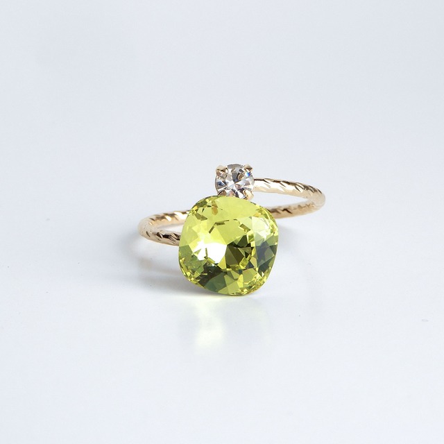 フォークリング《光のダンス》シトラスグリーン|10mm クッションカット クリスタル