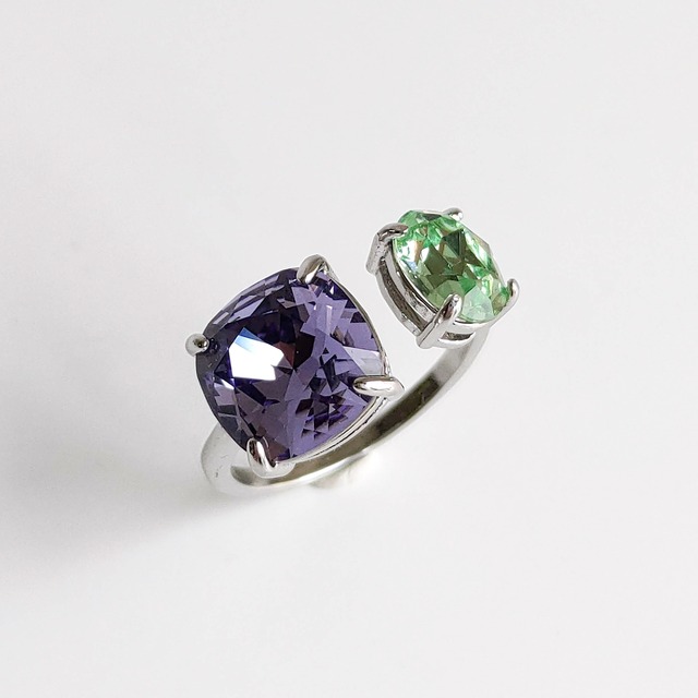 スミレパープル&イエローグリーン|ツイン クリスタル ビジュー・フォークリング|青紫 黄緑 おしゃれ フリー リング