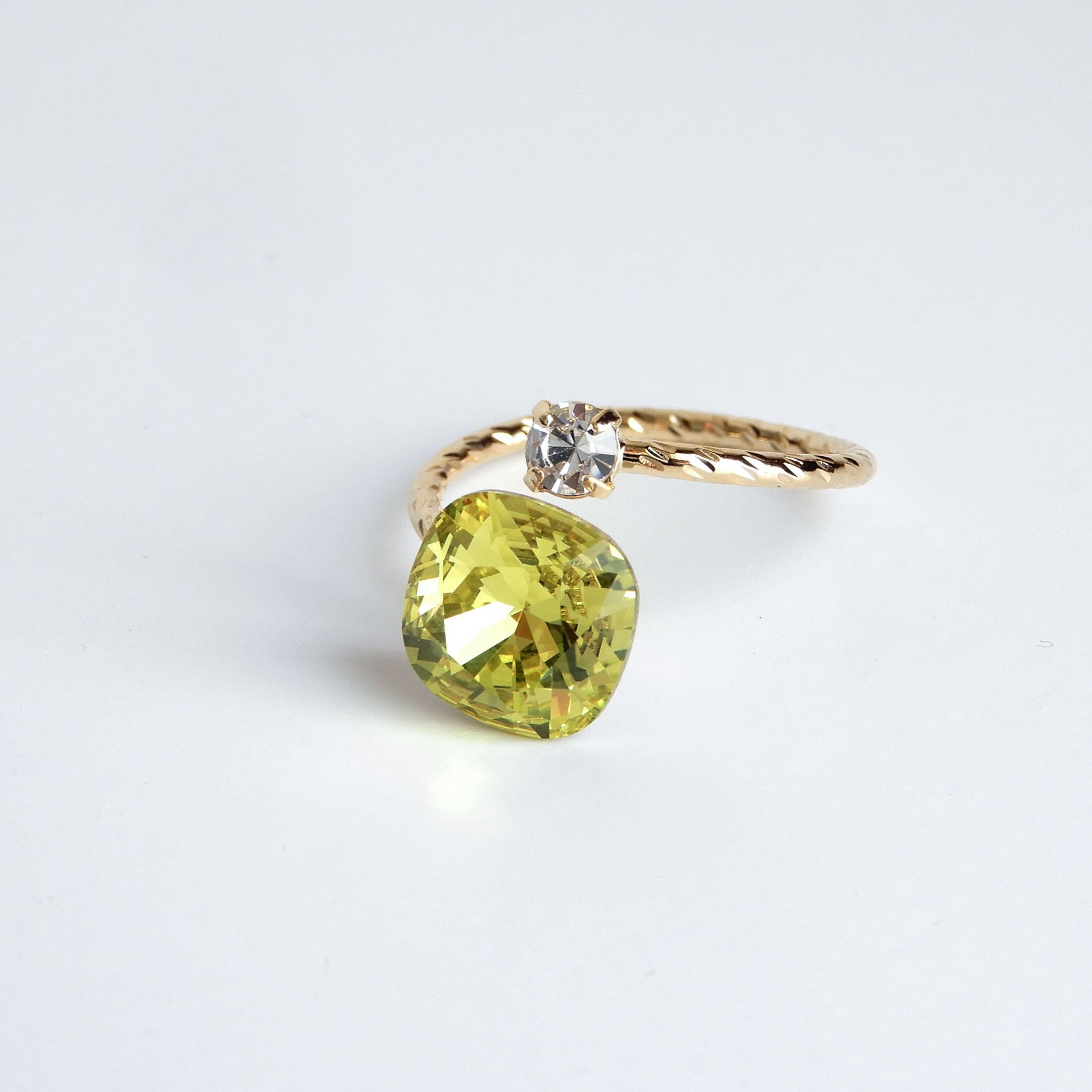 フォークリング《光のダンス》シトラスグリーン|10mm クッションカット クリスタル