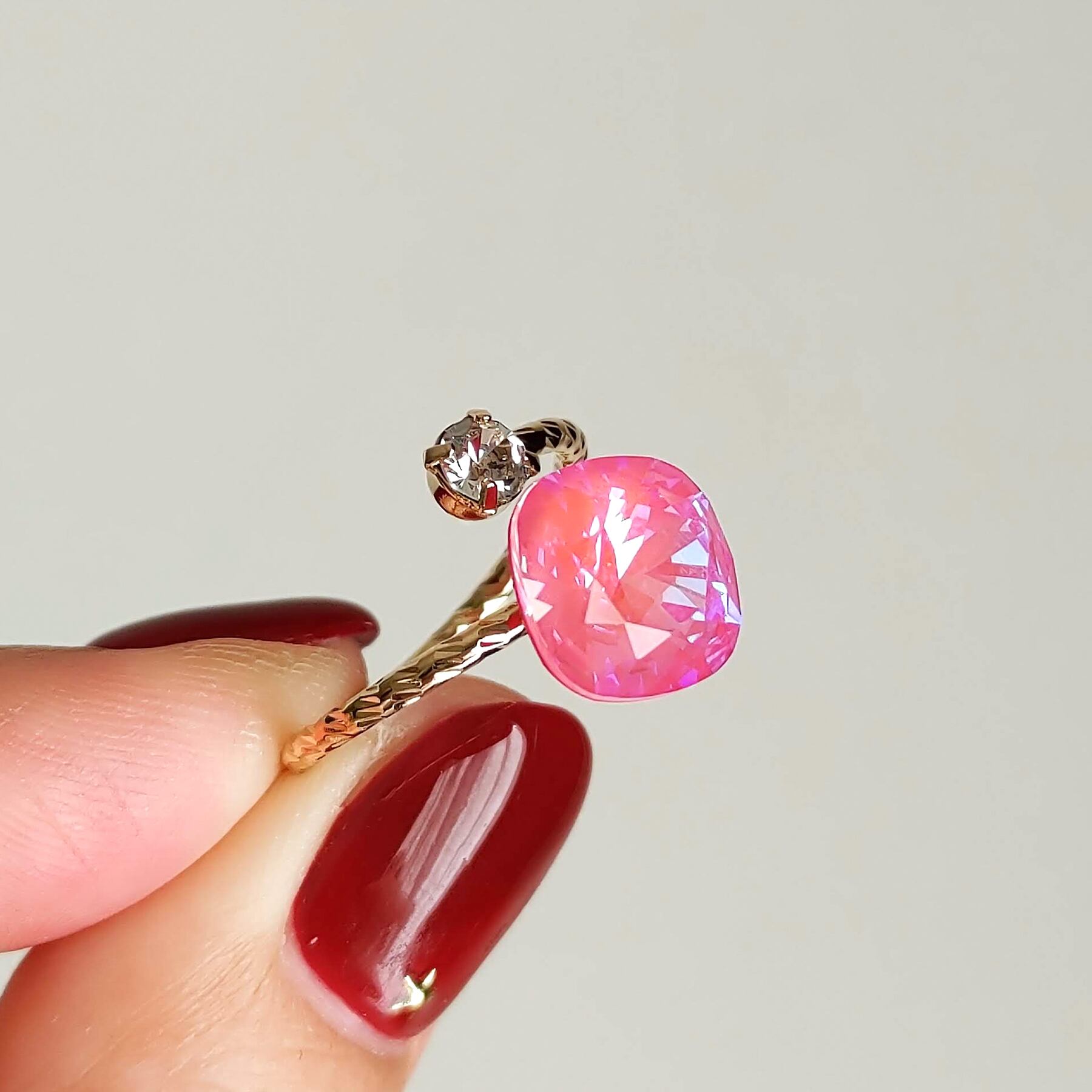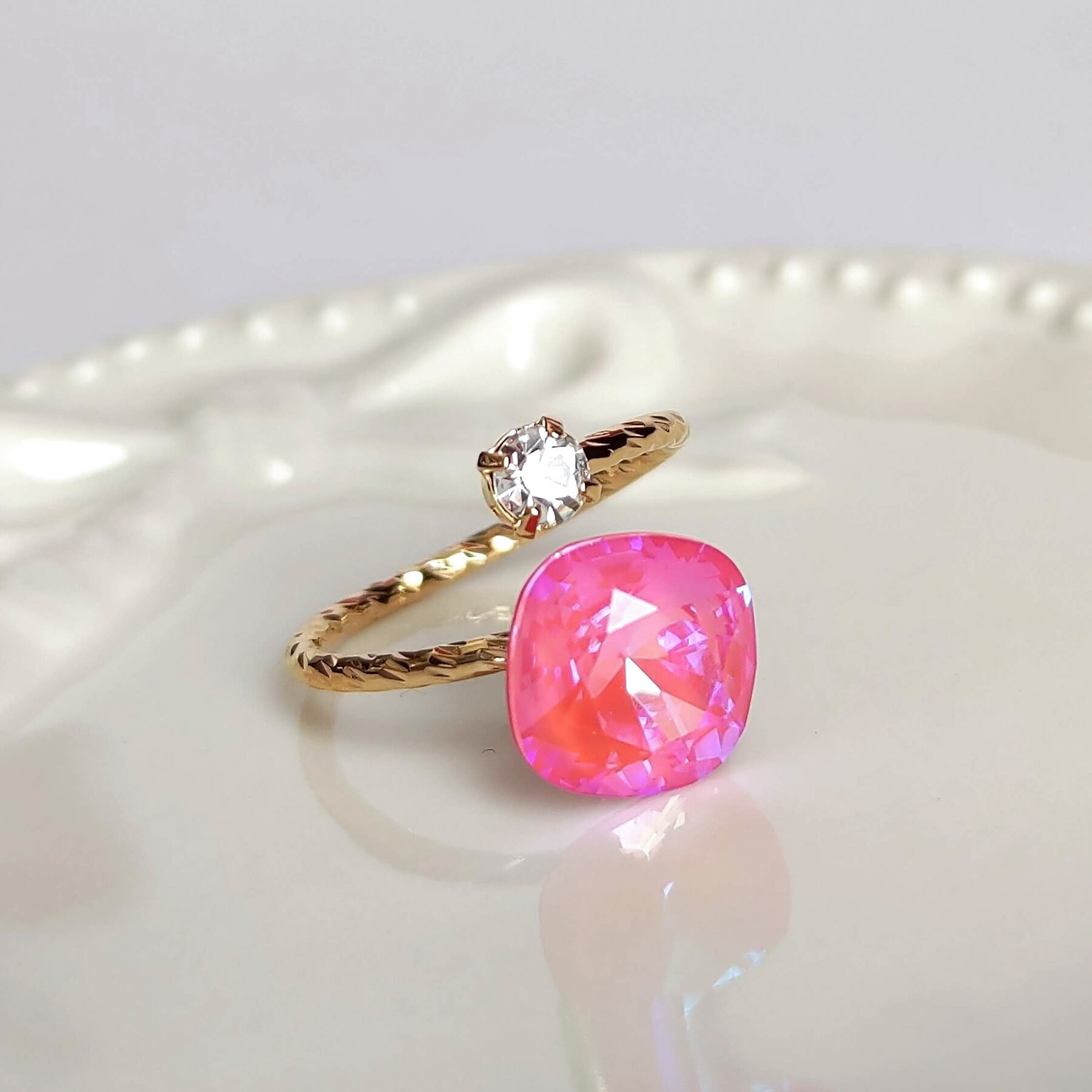 フォークリング《光のダンス》ロータスピンクディライト|10mm クッションカット 高品質クリスタル|推しカラー ピンク ガーリー かわいい