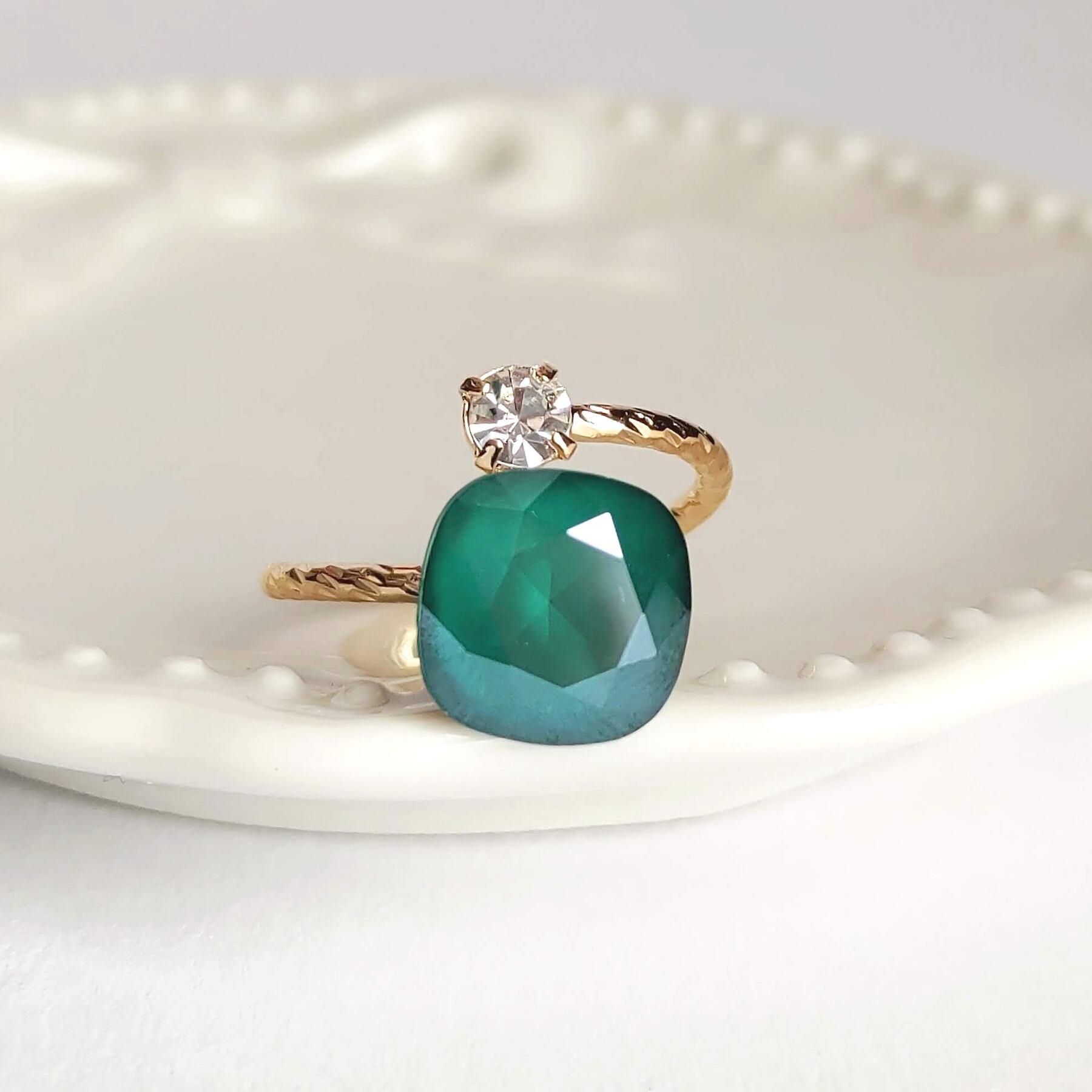 クッションカットと呼ばれる、角が丸いスクエア型の可愛いクリスタルビジューを使用。