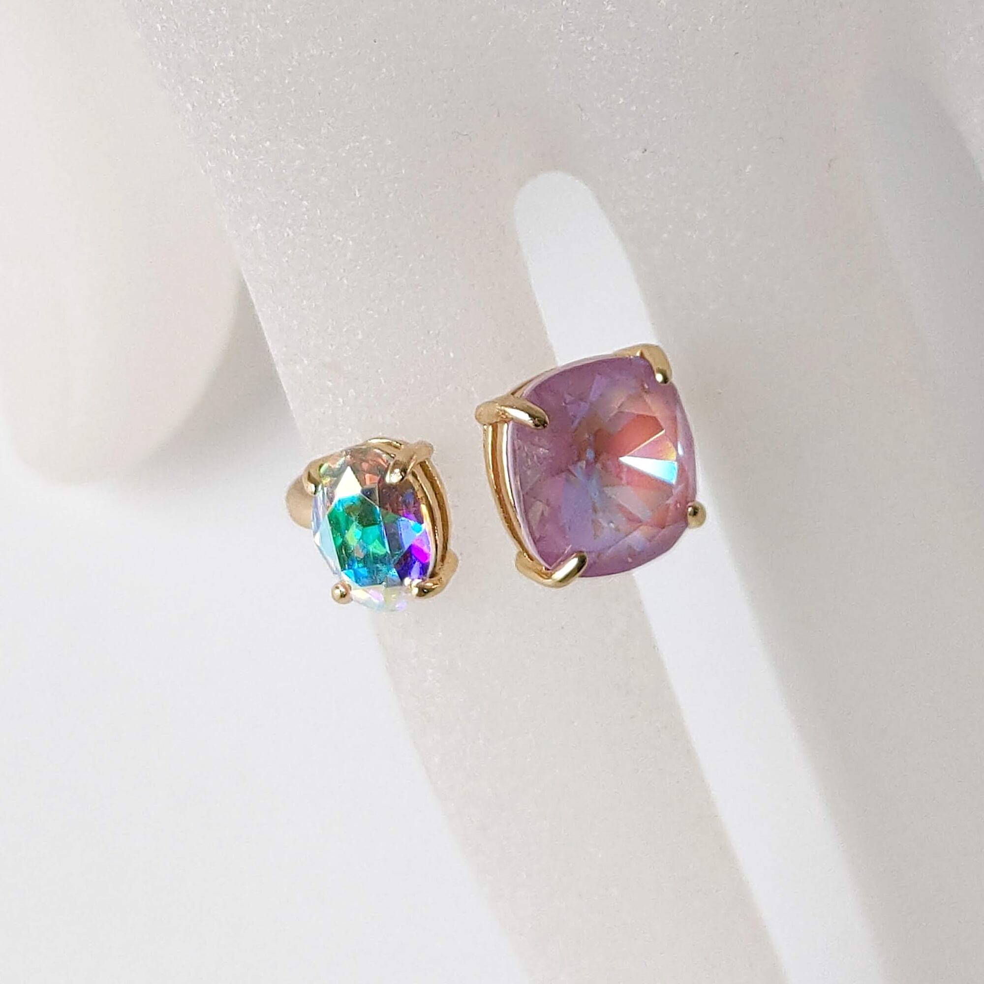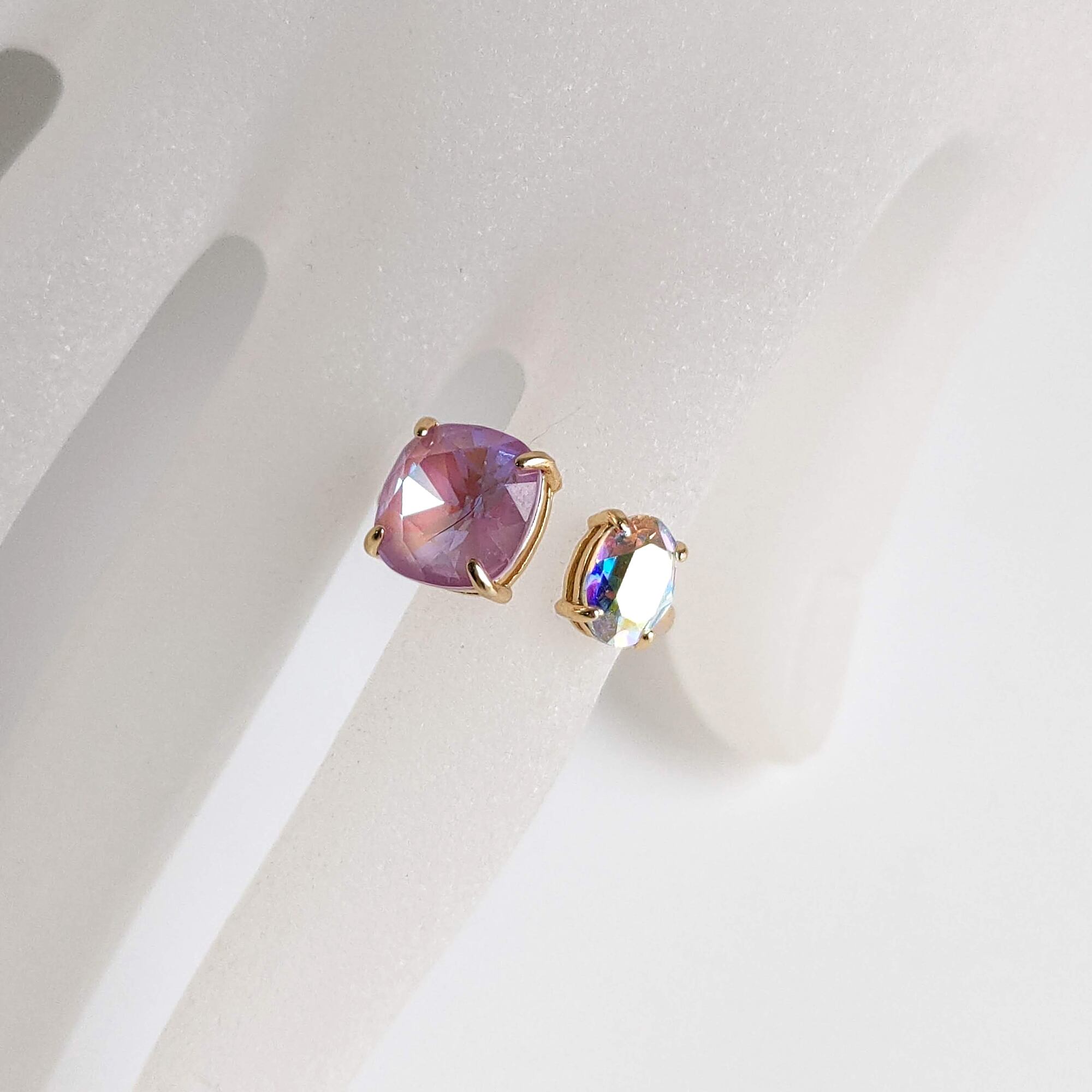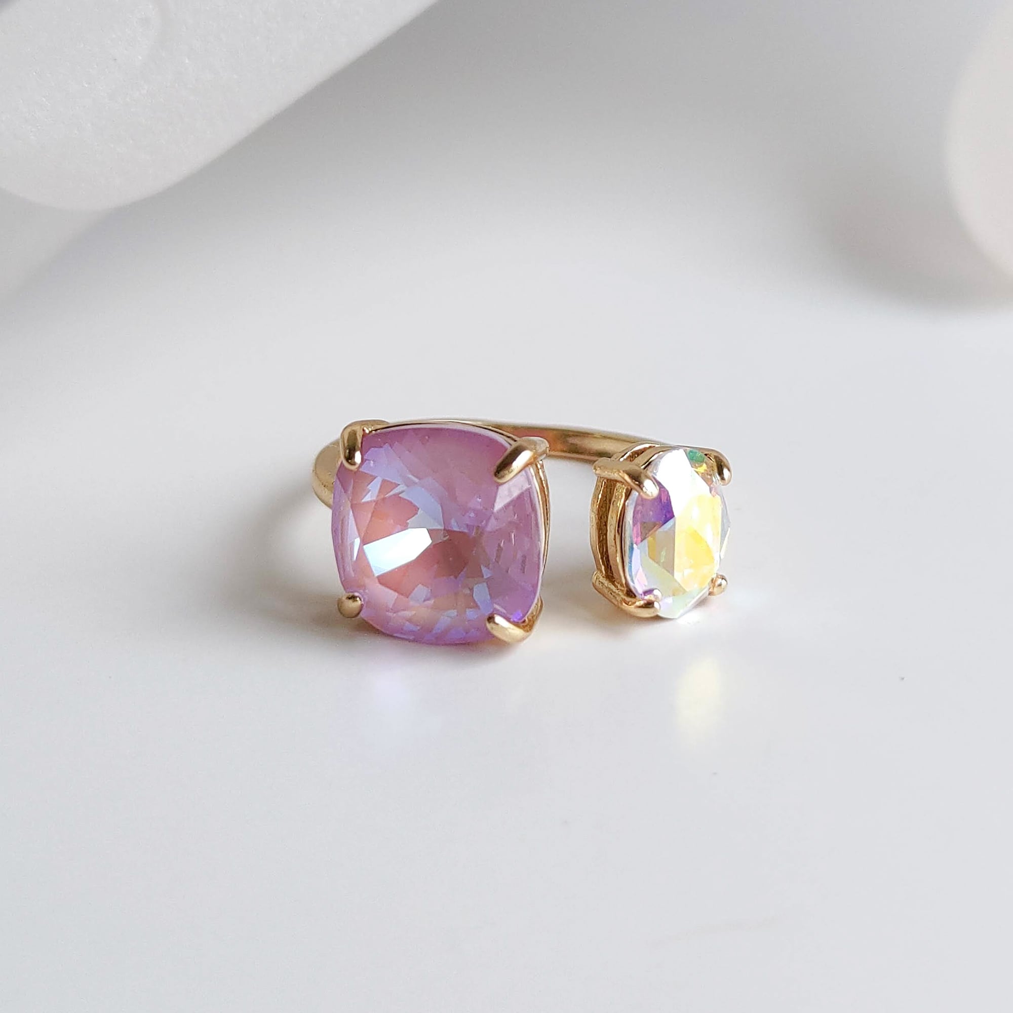 ピンクパープル&オーロラ|ツイン クリスタル ビジュー・フォークリング|桜色 清楚 上品