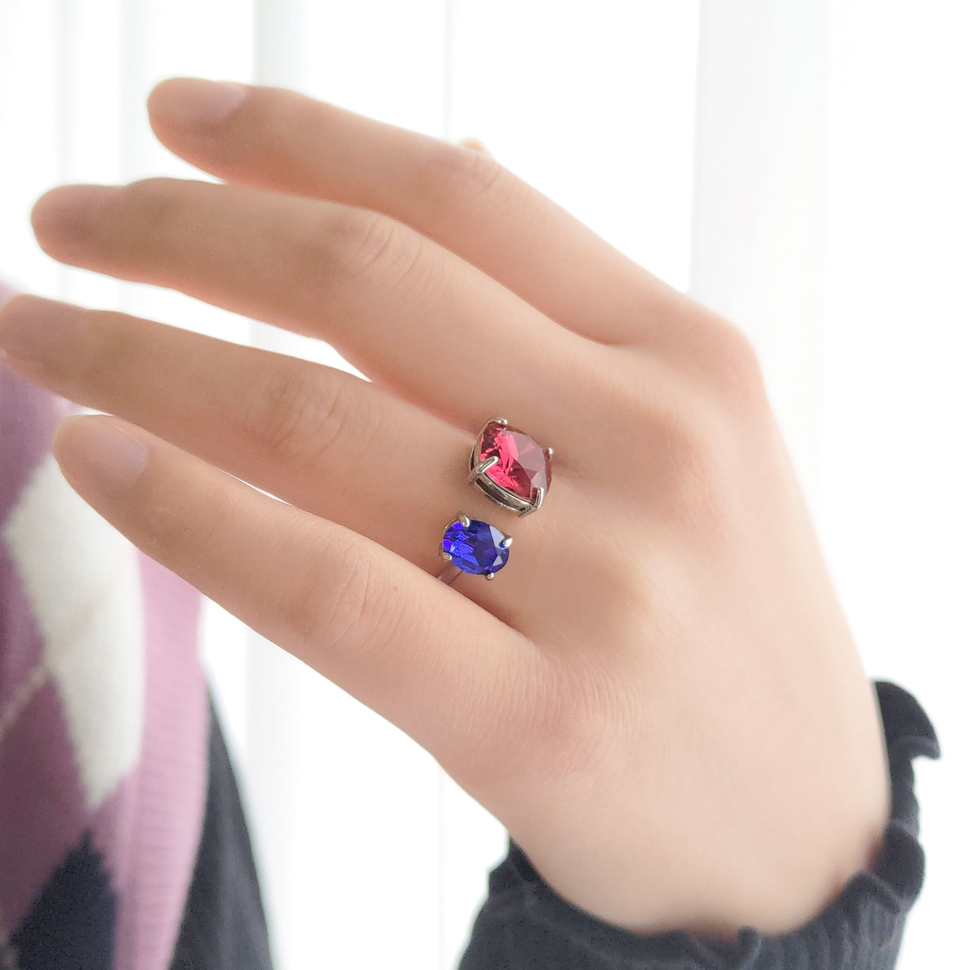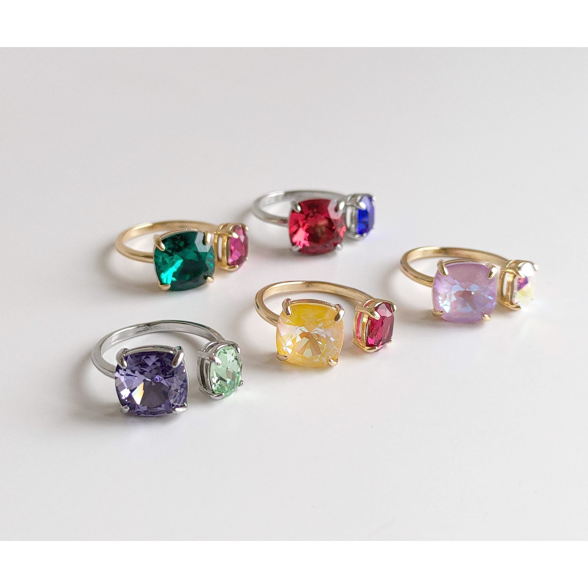 鮮やかカラーの大きめクリスタルビジューを2粒使用した、豪華なリング。