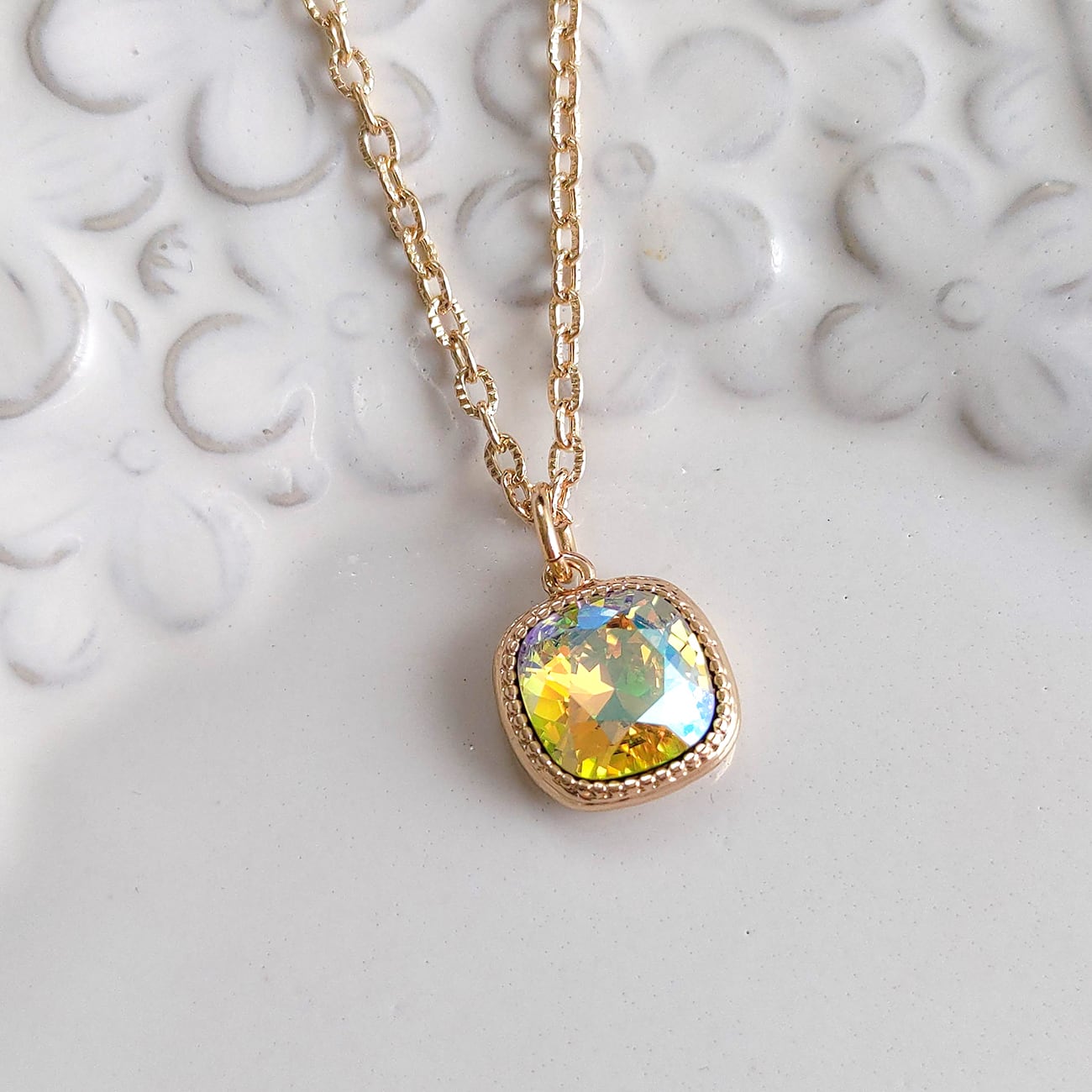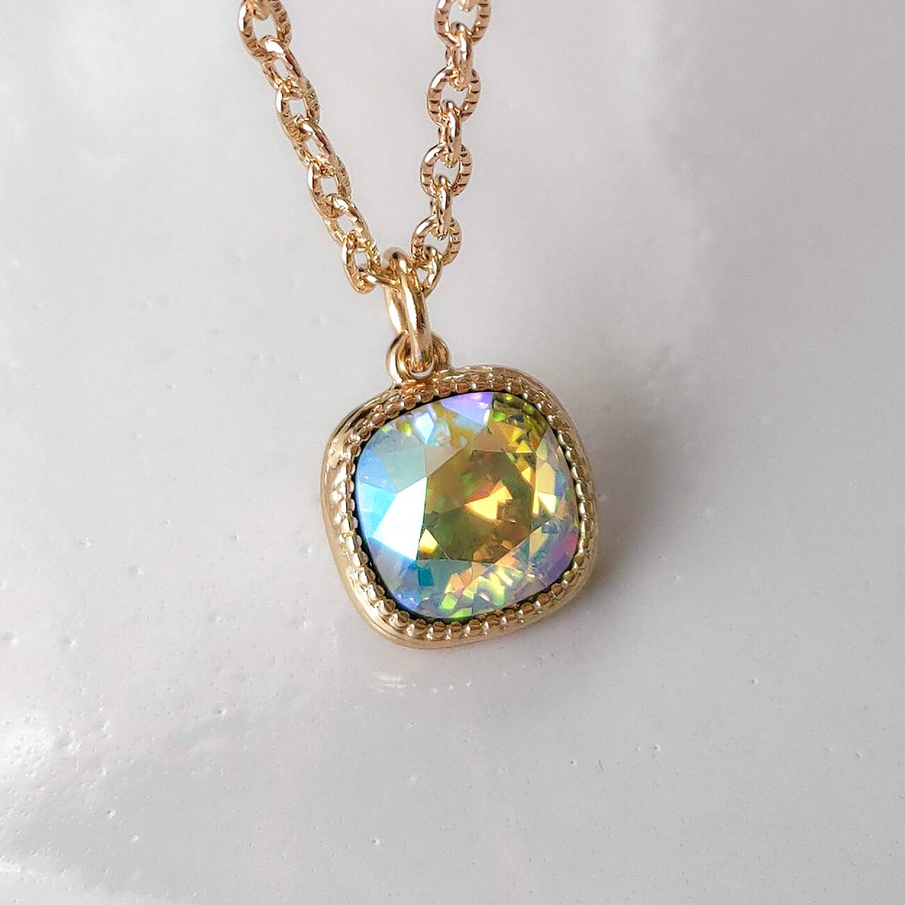希少 シトラスグリーンシマー|シンプル ネックレス|ころんとしたスクエア スワロ 使用 ライムグリーン